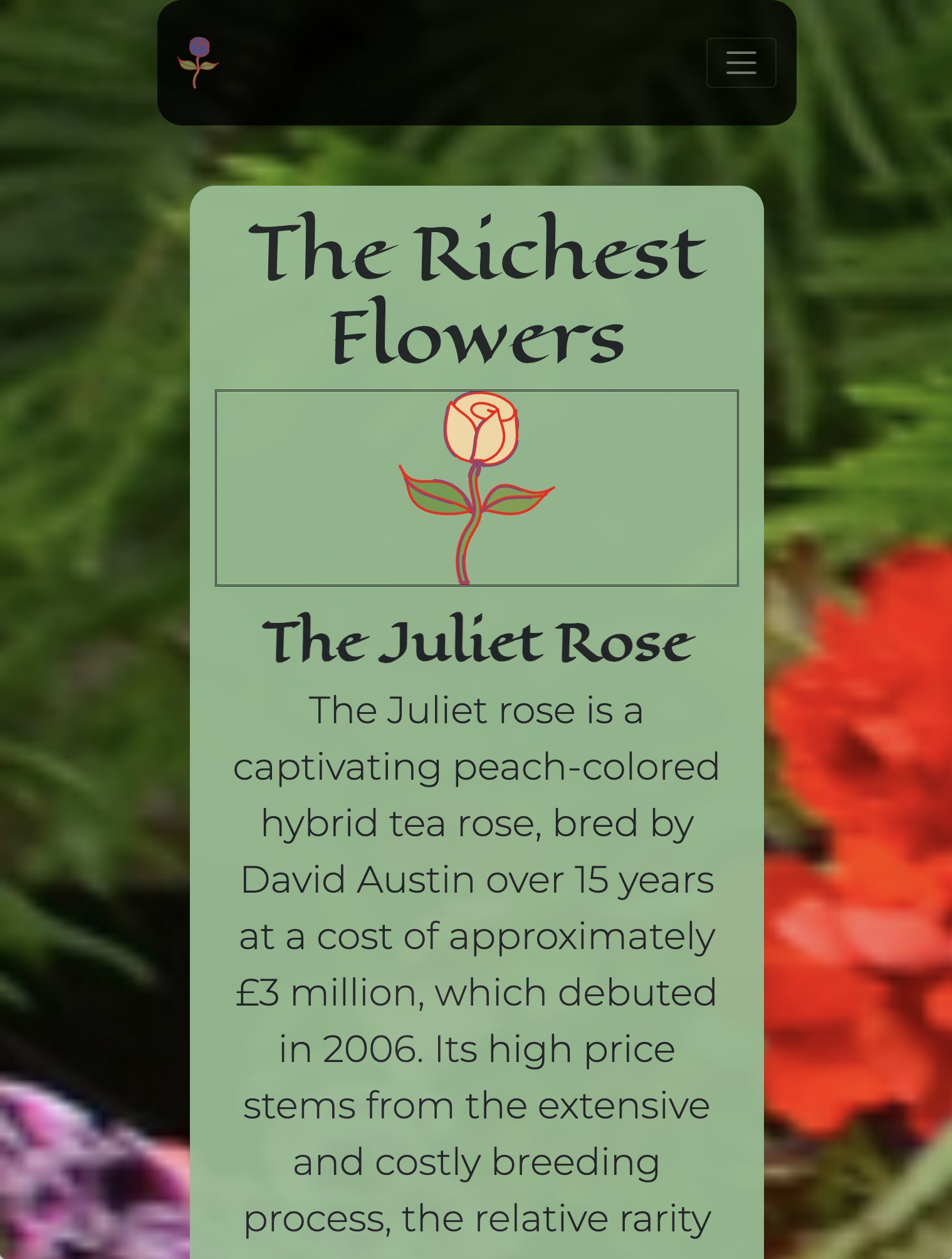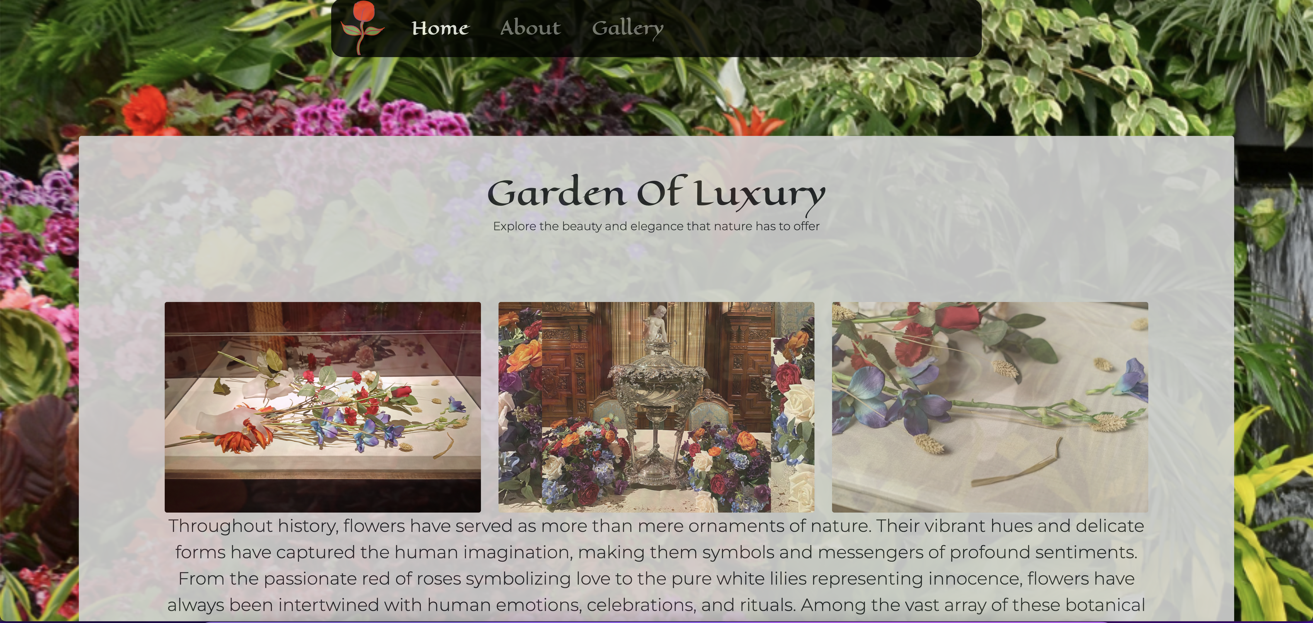 This website titled "Garden Of Luxury" explores the world of florals and the rich history that lies behind it. Inspired by the Drie Haus Musseum In Chicago, this web page features a gallery of the elegance and fascination around the most expensive flowers in the world. Through animation and symbolic significance