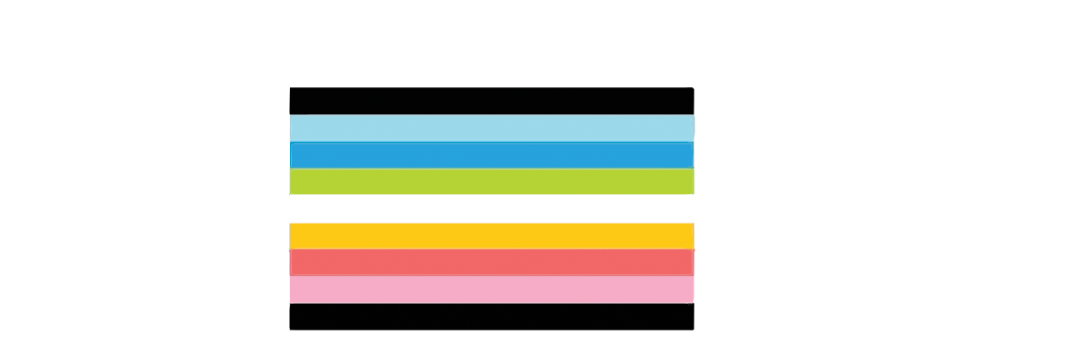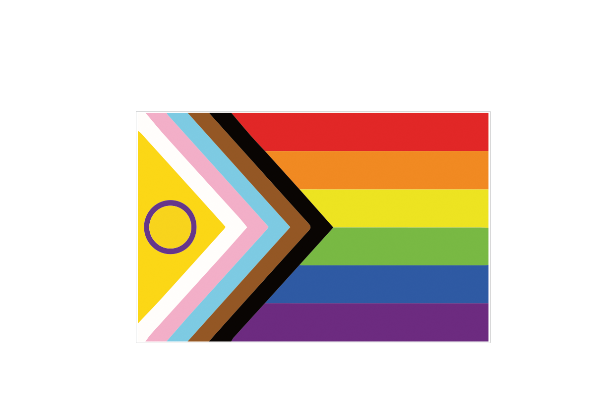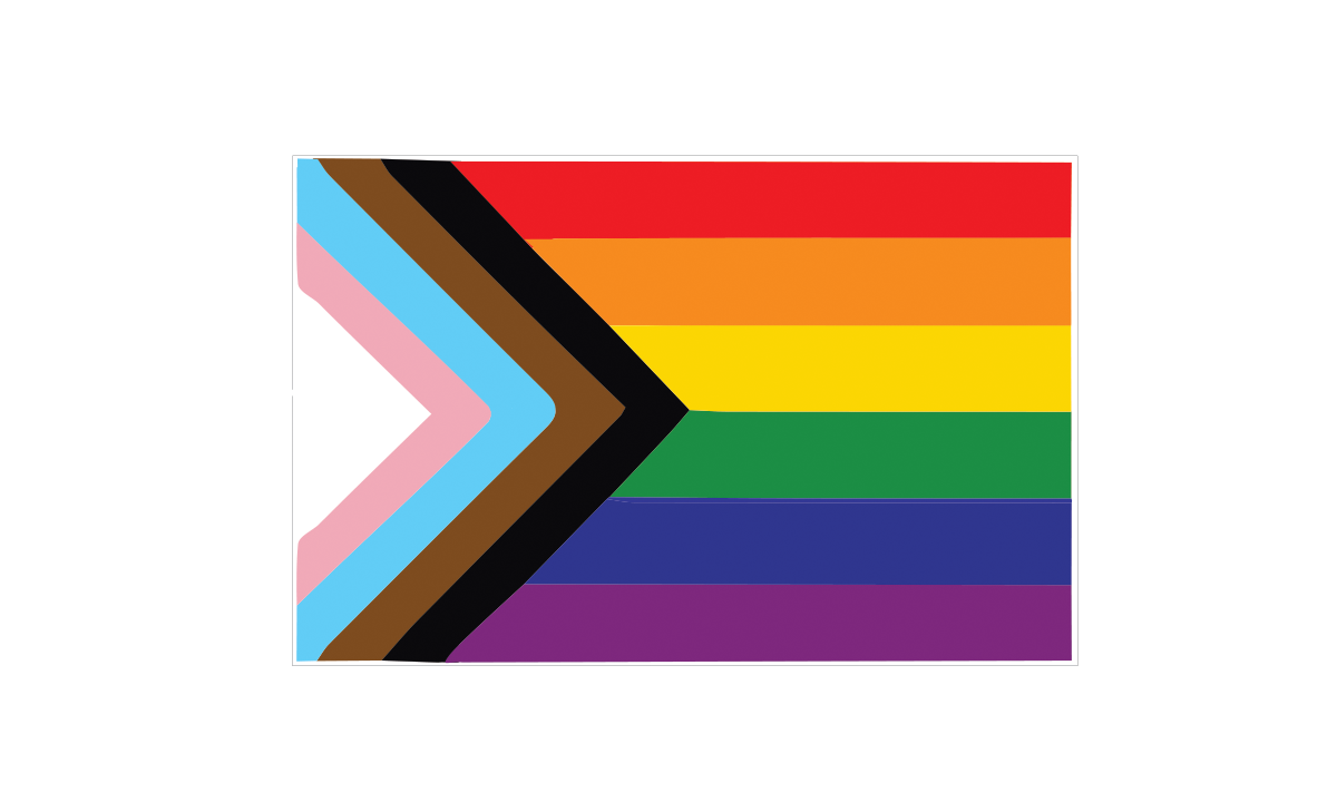 Created by Daniel Quasar in 2018, the Pride Progress Flag features black and brown stripes to portray marginalized LGBTQ+ communities of color and baby blue, pink and white to incorporate the trans flag in its design. Daniel displaced the trans flag stripes and marginalized community stripes to the flag’s hoist, where they form a new arrow shape. The arrow leads to the right to confer forward movement while purposely being along the left edge, pointing to the fact that much progress still needs to be made.