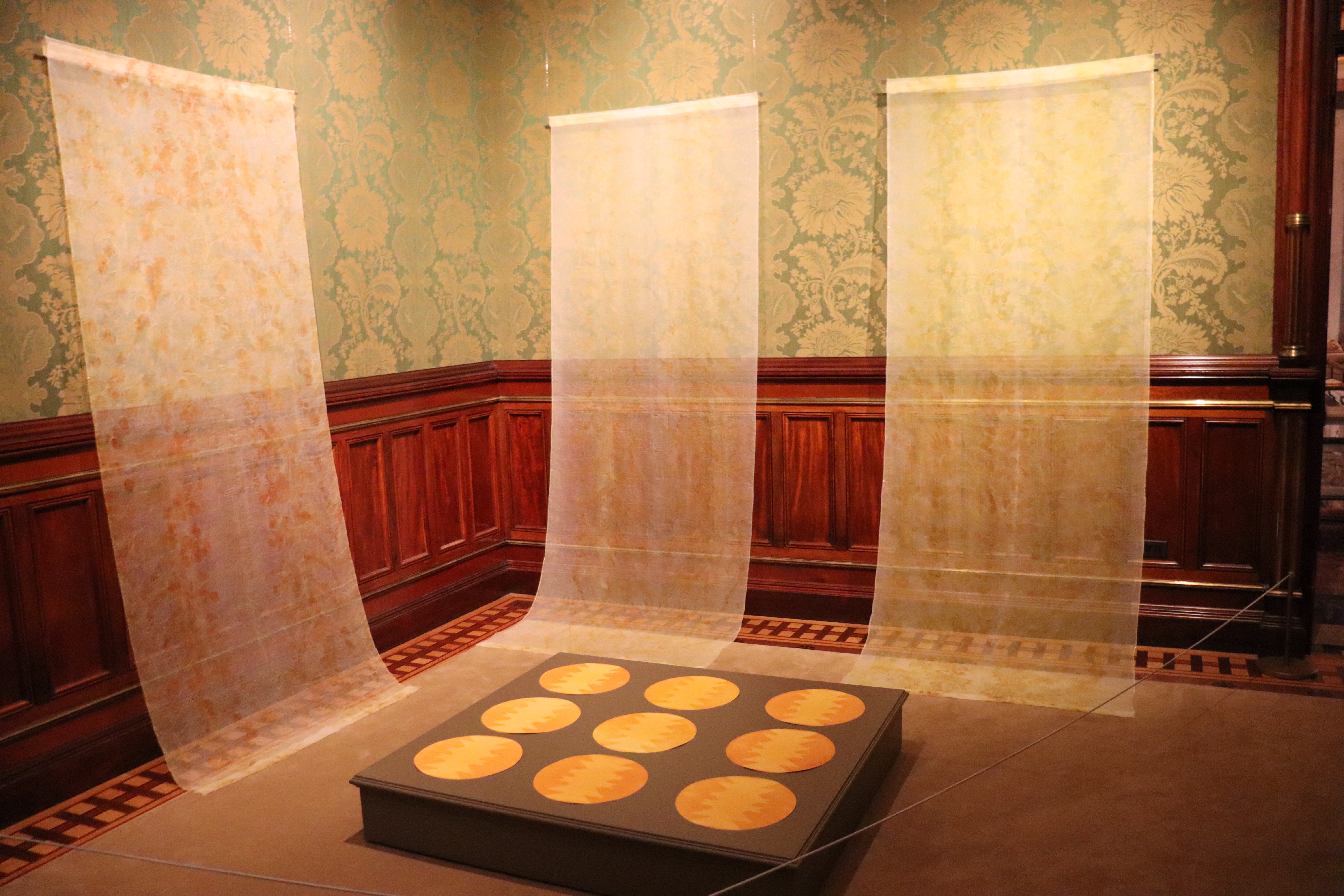 Dakota Mace's Dáda'ak'ehgo łitso is a reference to Dine indigenous culture and how co-creation and dependency shaped the Driehaus iterations. The installation transforms a historically private space—Mrs. Nickerson’s bedroom—into an immersive homage to Diné culture. Using natural dyes and eco-printing, Mace links cultural memory to environmental textures, honoring Indigenous contributions and intergenerational care that are absent from dominant historical narratives.