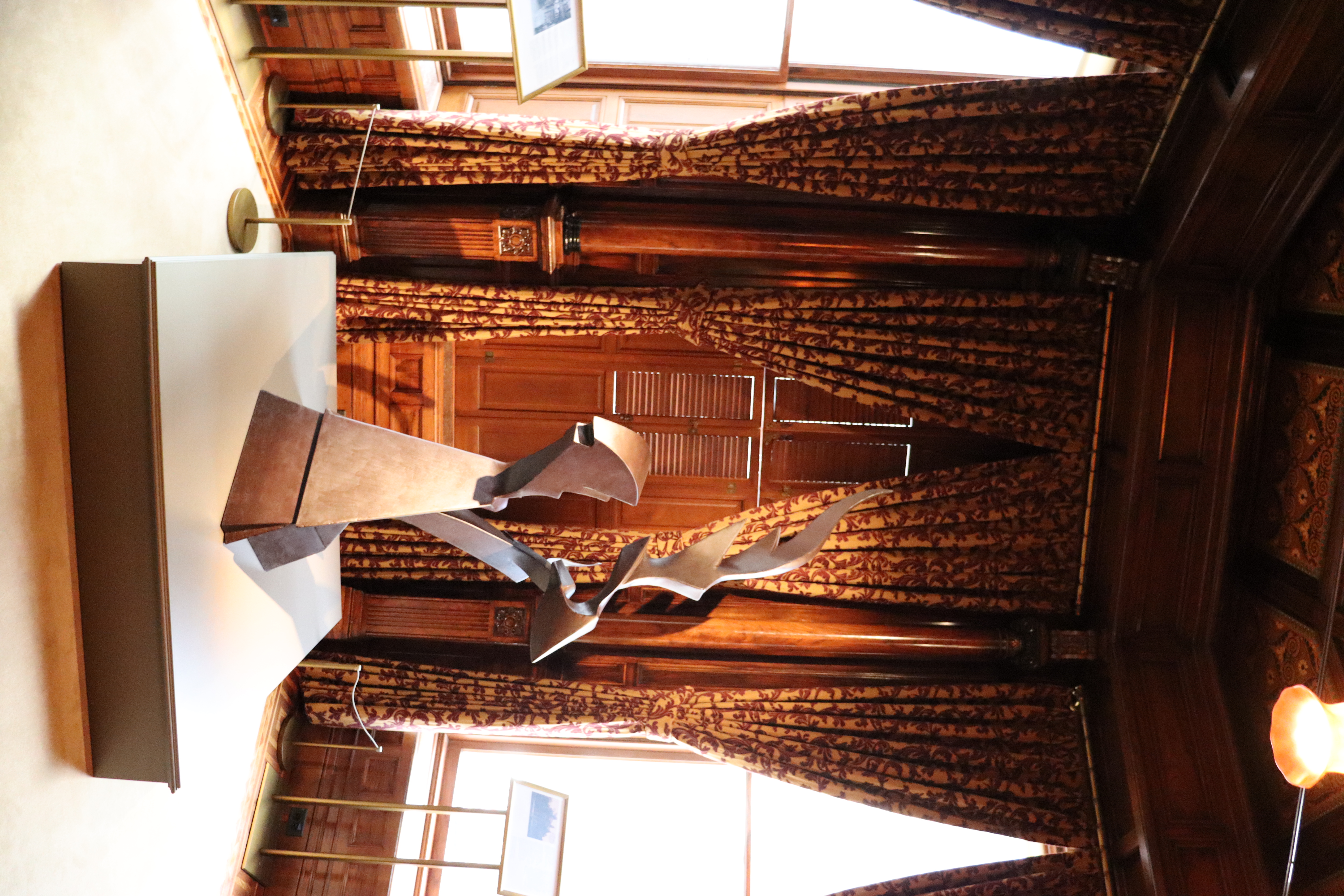 Richard Hunt's Divided Growth features a firebird-shaped sculpture forged from Cor-Ten steel, symbolizing rebirth and African American resilience. Positioned near Japanese Meiji period artifacts collected by the Nickersons, Hunt’s work critiques the exoticism of non-Western art by reclaiming space for African American narratives rooted in struggle and transformation.