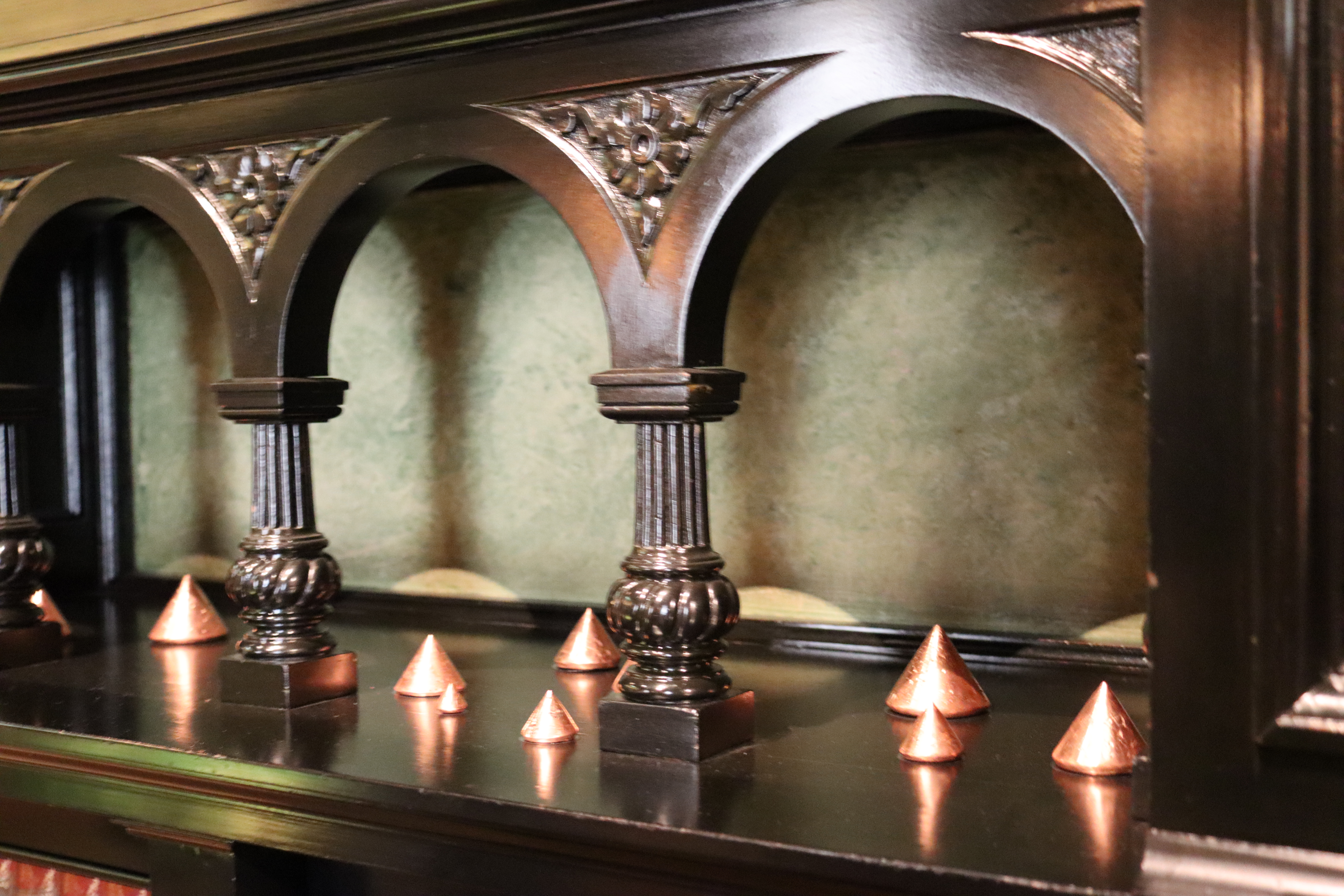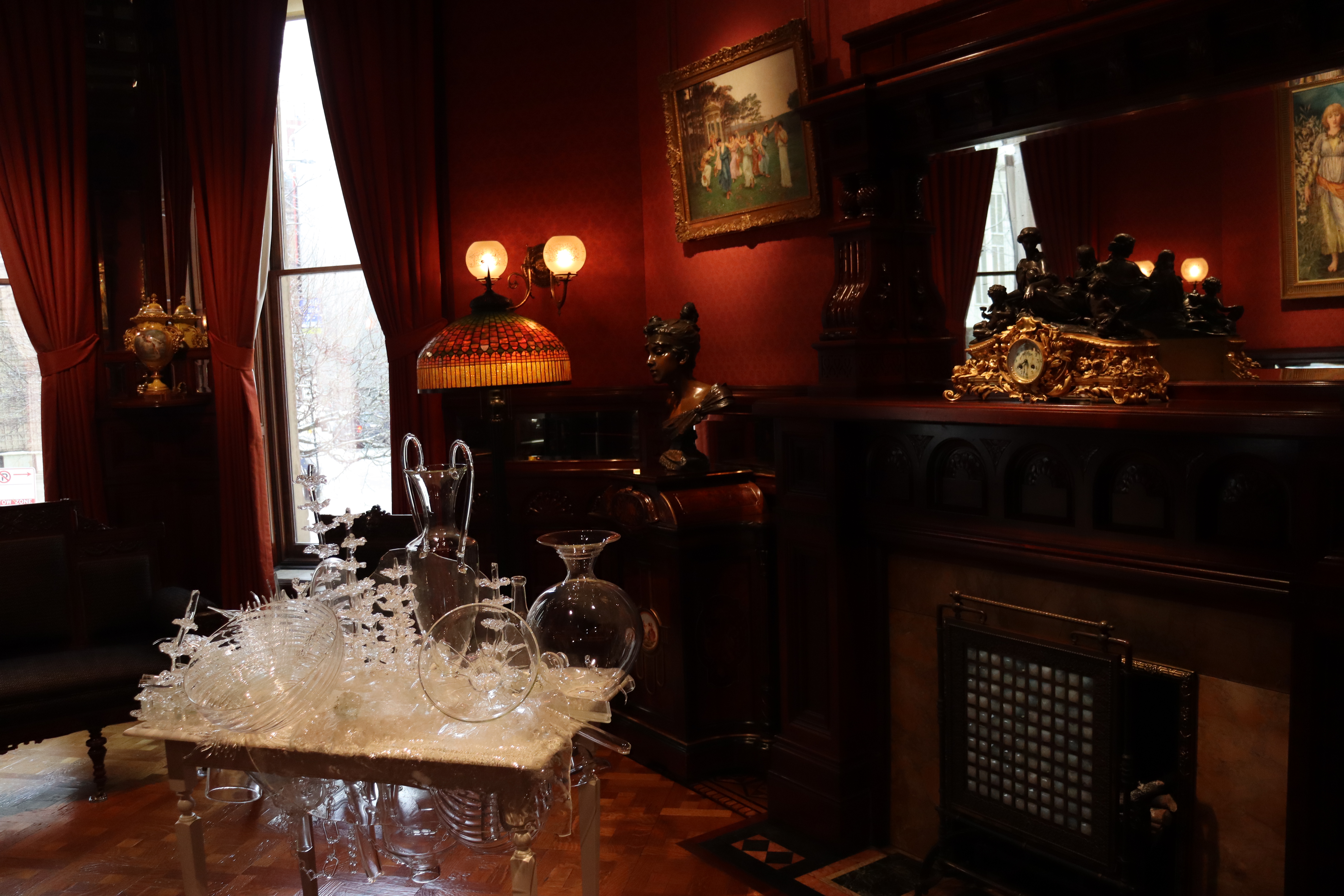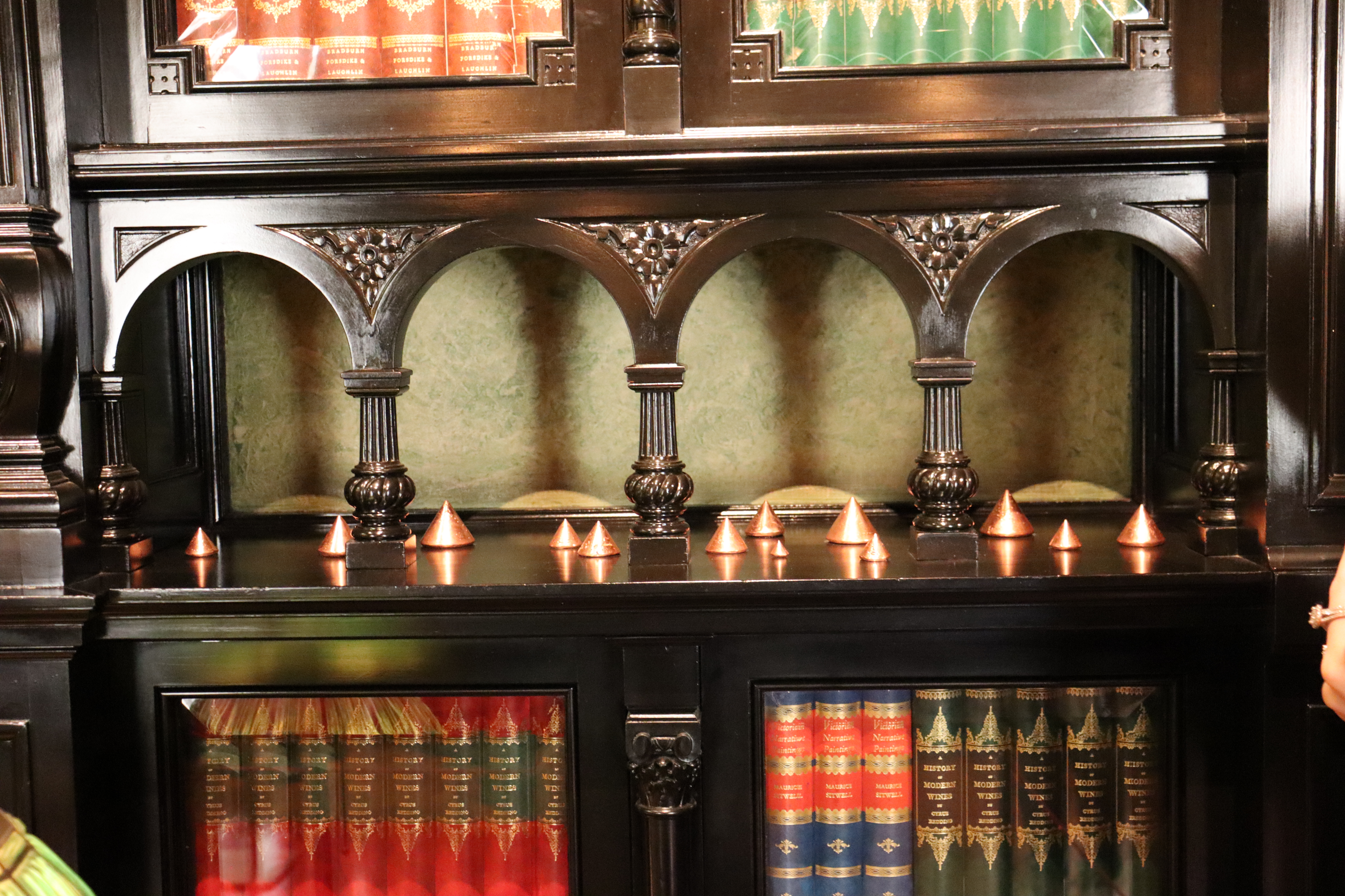 Across the room from the installation, on the bookshelf, are a collection of small copper cones—which could nod to and represent the fire that ravaged the Nickerson Mansion during the Chicago Fire.