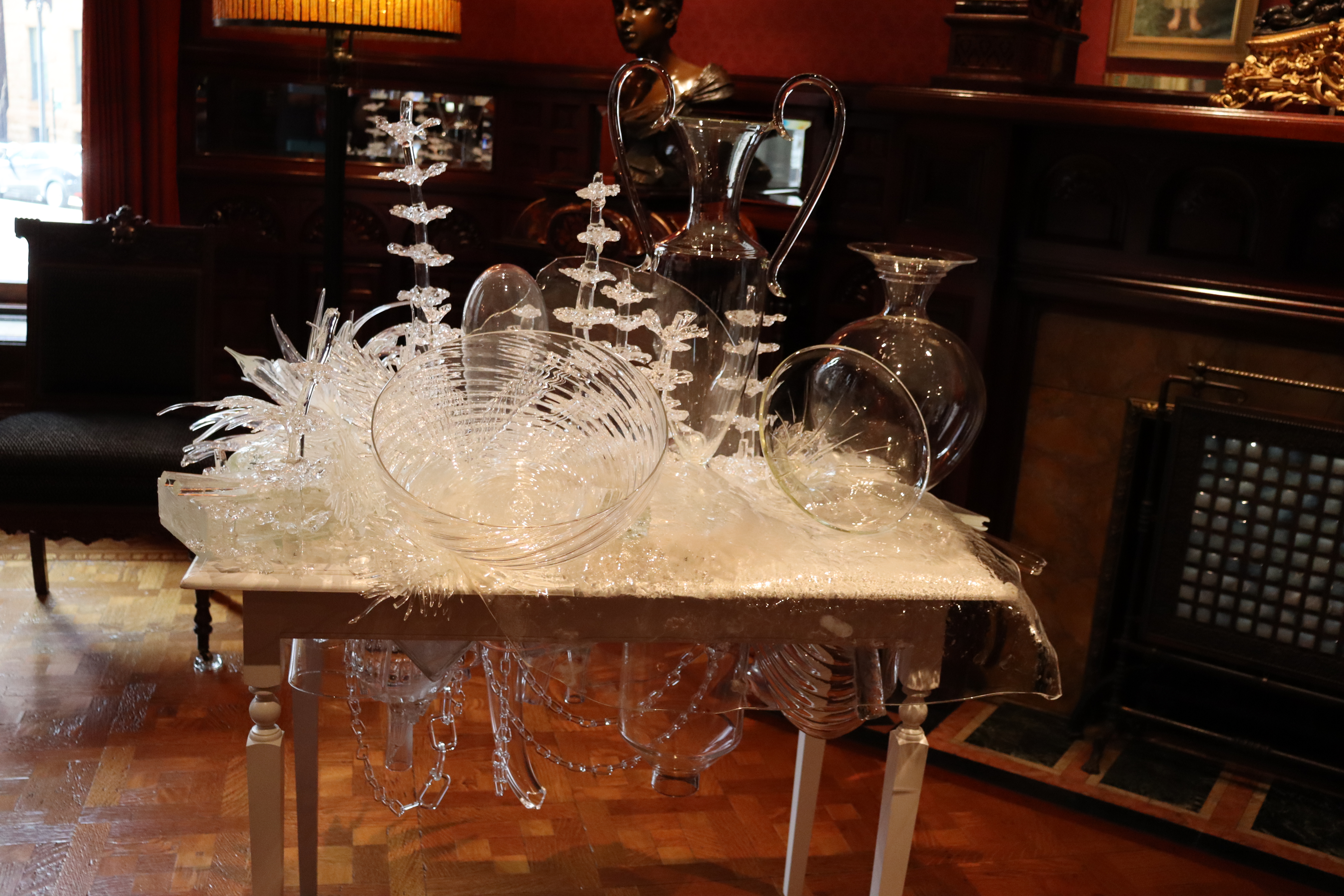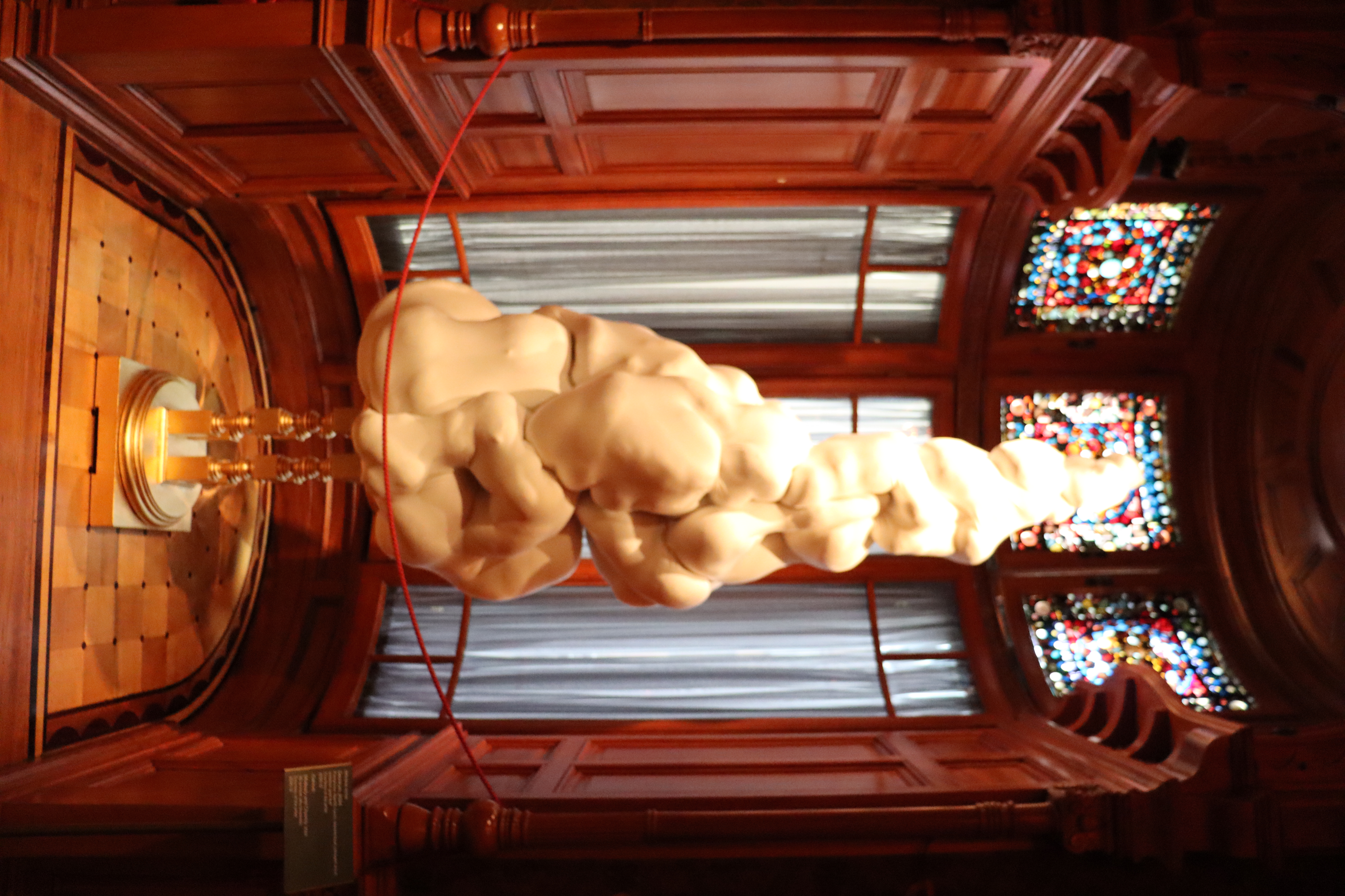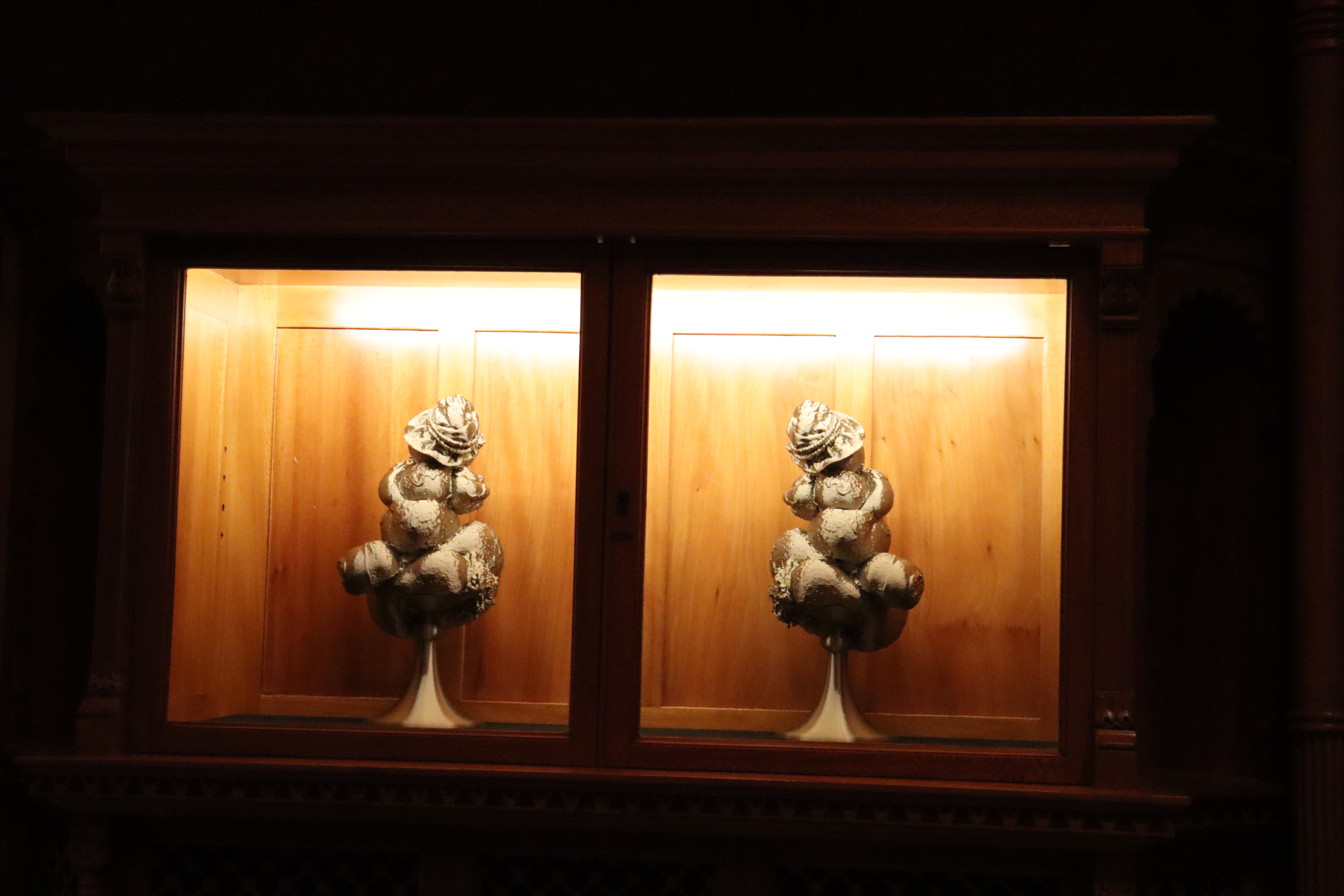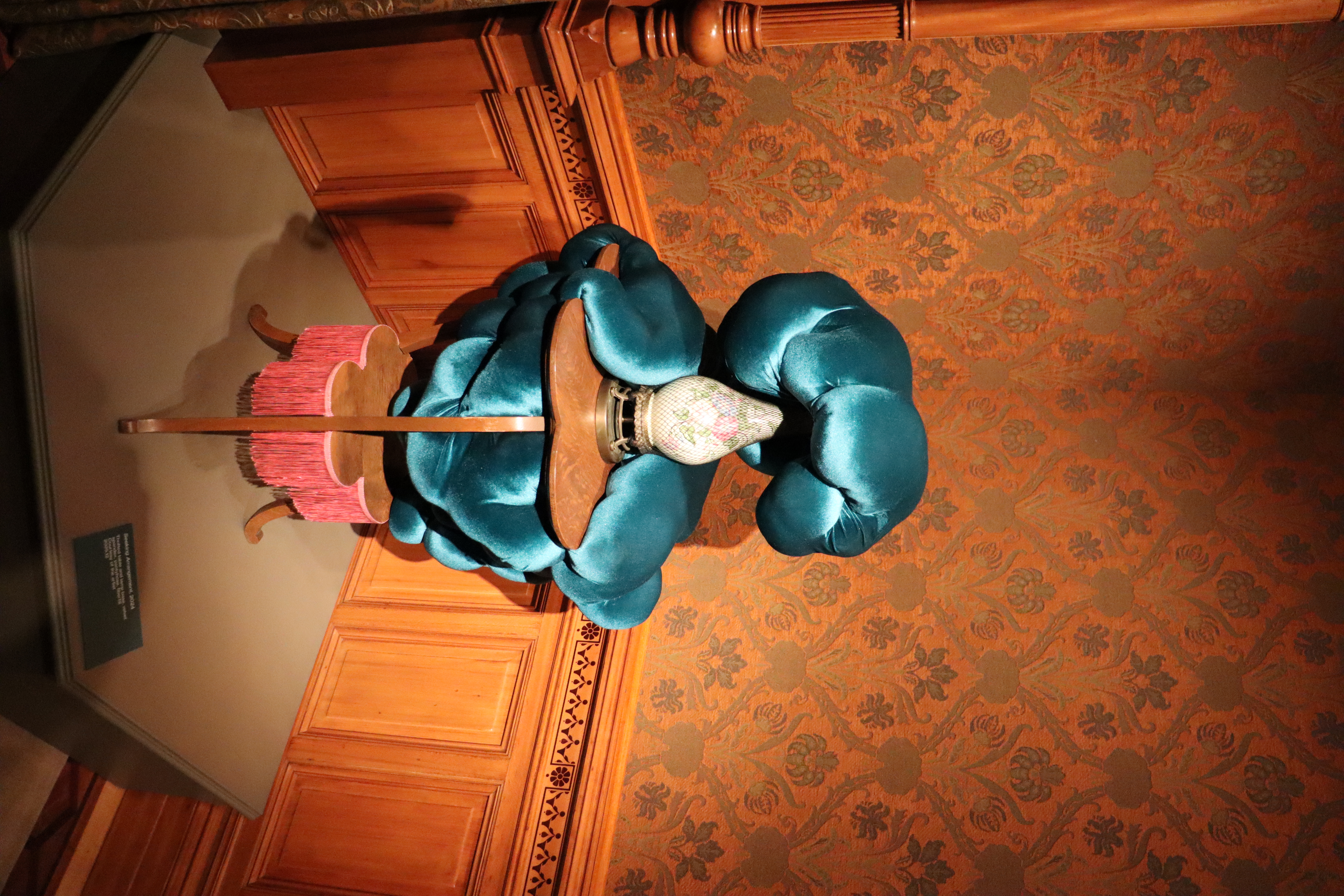 Across the room from the installation, on the bookshelf, are a collection of small copper cones—which could nod to and represent the fire that ravaged the Nickerson Mansion during the Chicago Fire.