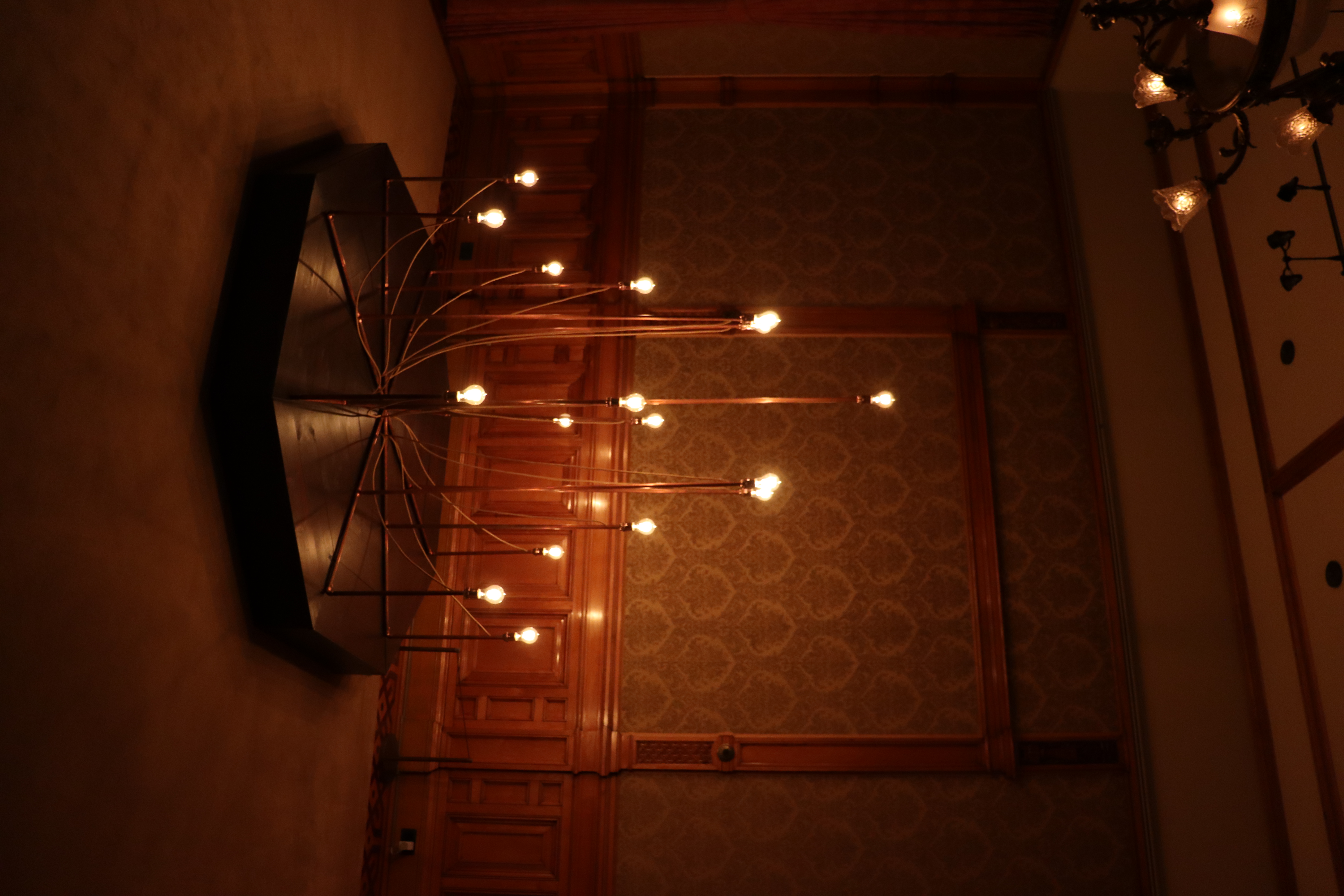 Luftwerk's Konstellation is a luminous installation made of inverted Edison bulbs, referencing the introduction of electricity in elite homes at the turn of the century. The chandelier not only showcases early technological sophistication but also draws poetic parallels between domestic light and constellations, emphasizing how wealth was linked to both innovation and a sense of divine aspiration. The Edison bulbs also symbolize the flow of wealth and the illumination of privilege within these grand spaces.