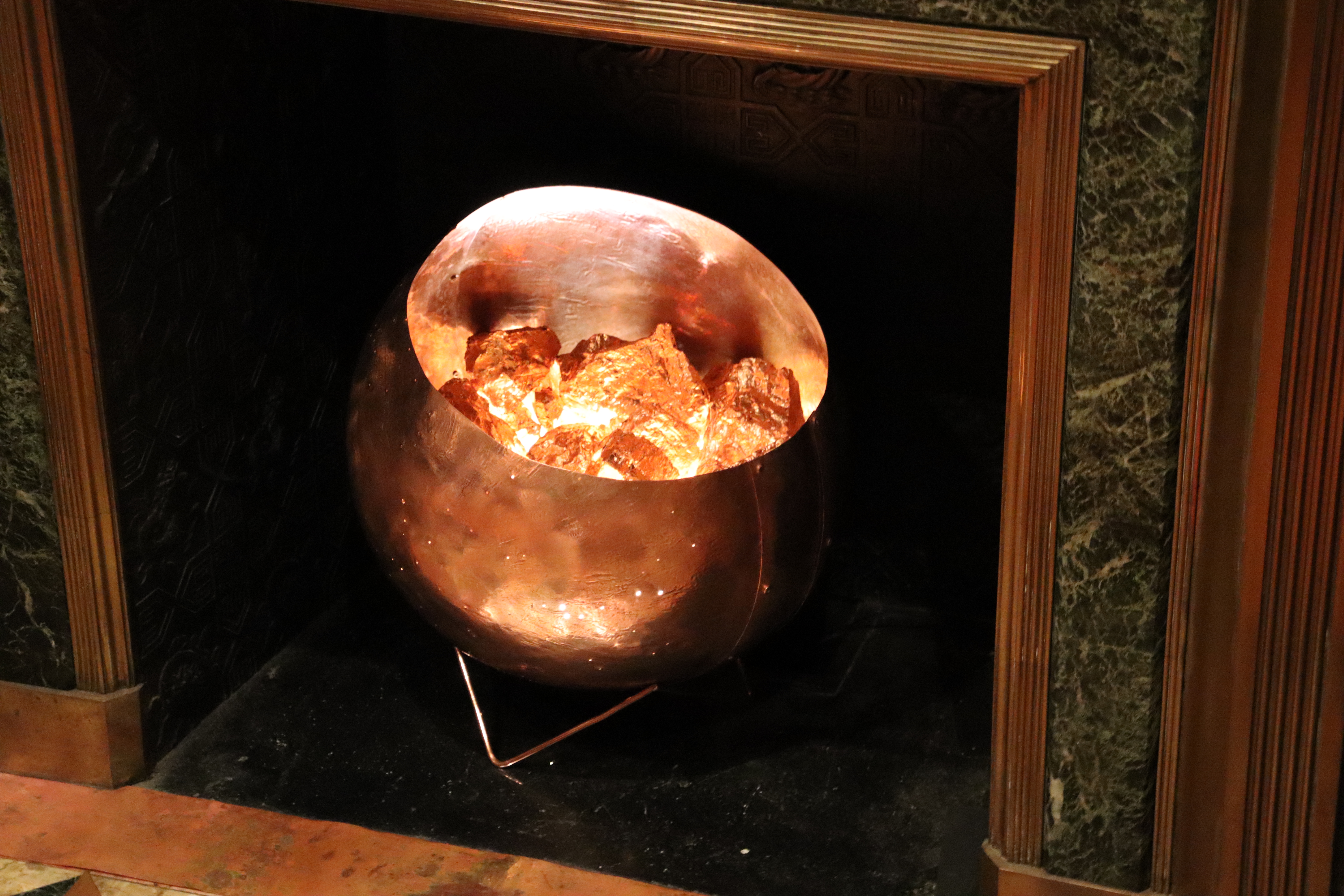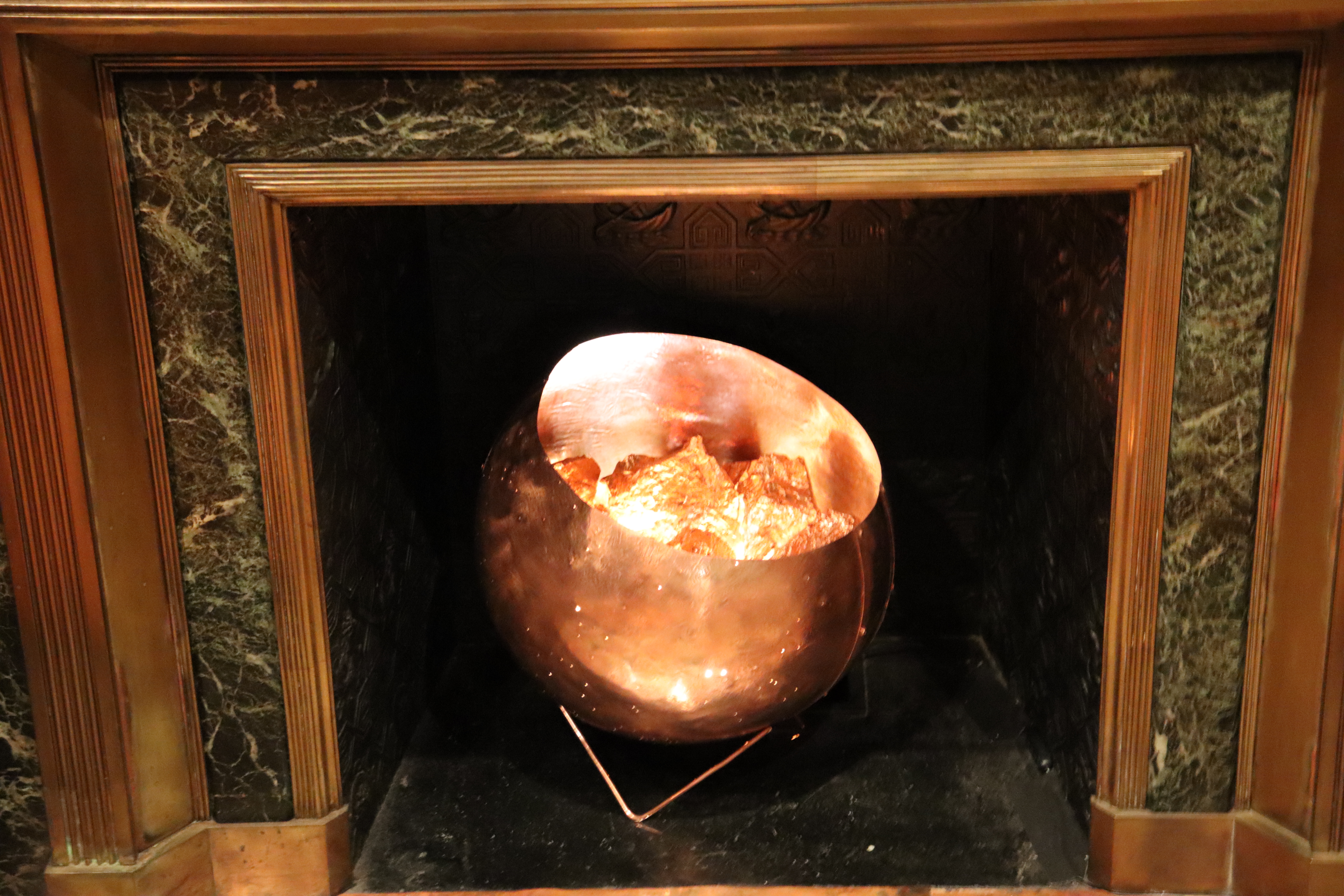 Rebecca Beachy's Mercury’s Hearth: Coal, Electricity, Fire and Industry reimagines a coal hod as a globe adorned with a star map of the night of the Great Chicago Fire. Situated near copper cones evoking the blaze itself, the installation connects the mansion’s post-fire rebuilding to the broader narrative of industrialization, environmental cost, and human ambition driven by progress.