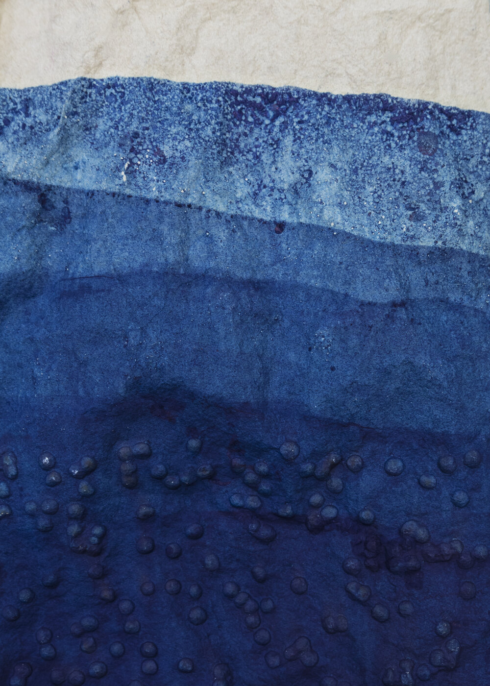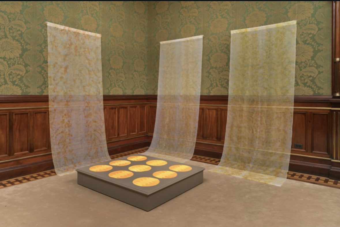 Dáda'ak'ehgo titso (there are yellow fields all around), 2024 Paper, silk, natural pigments Courtesy of the artist 2025.11 Once natural materials are transformed into architectural or design elements, it becomes easy to overlook or even forget their past livingness and connection to faraway lands. Plants and flowers abound across the wallpapers and carved wood paneling of the Nickerson Mansion, albeit only in the form of representations. Tapping into the intimate connection of vegetal pigmentation, Mace brings nature into the building on a pure, elemental level. Responding to the textile nature of wallpapers, carpets, and tapestries around the building, these yellow color fields, blending silk and anthotype photographic processes, re-envision the transcendental tradition of modernist color-field painting to recover past histories in the artist's Diné, Indigenous culture. In this tradition, yellow is a healing color. Change, lifespan, and evolution- from the delicate shades of sagebrush to the vibrant hues of Osage orange, Mace pays tribute to the histories of co-creation and dependency that have characterized the building's multiple iterations over time.